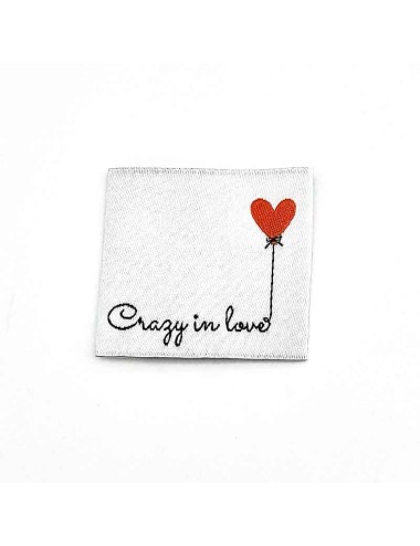 Cette étiquette tissée de couleur blanche avec l'inscription "Crazy in love " est à coudre sur vos vêtements.
