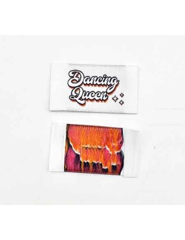 Cette étiquette tissée de couleur blanche avec l'inscription "Dancing Queen" est à coudre sur vos vêtements.