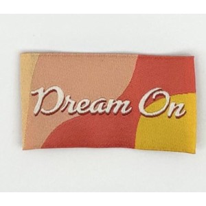 Cette étiquette tissée avec l’inscription "Dream On" en crème sur fond corail et moutarde est à coudre sur vos vêtements.