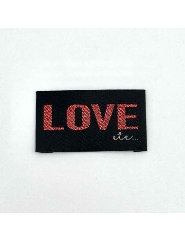 Cette étiquette tissée de couleur noir avec l’inscription "love etc" en lurex rouge est à coudre sur vos vêtements.