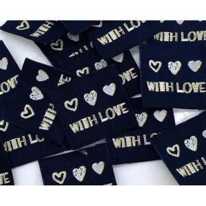Cette étiquette tissée de couleur noir avec l’inscription "With love" en lurex est à coudre sur vos vêtements.