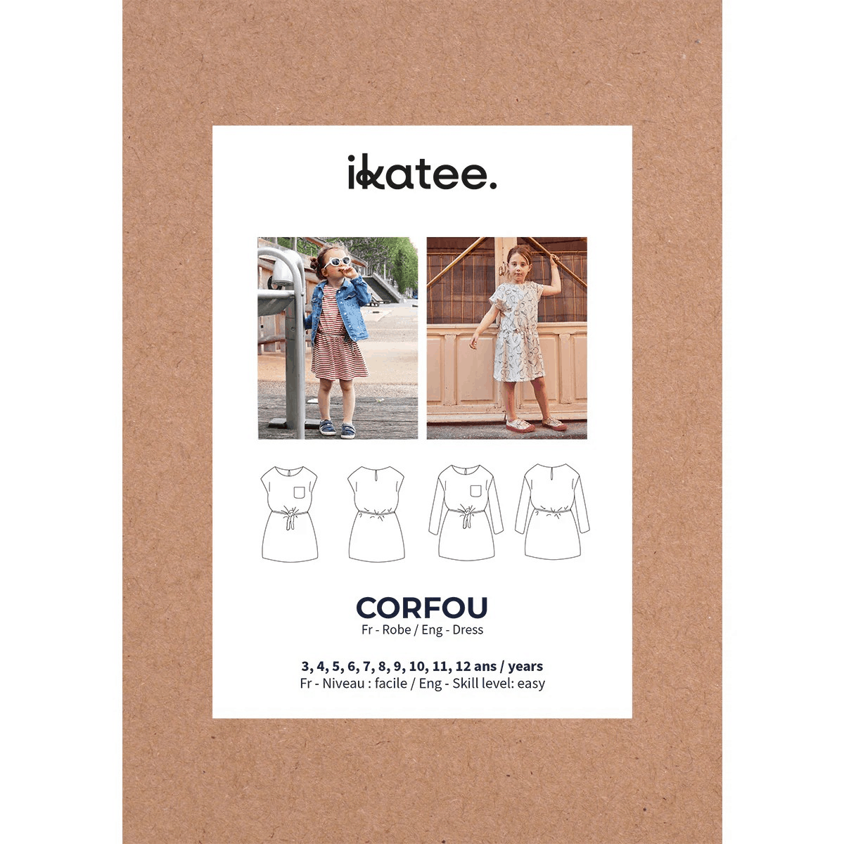 Corfou est un patron de robe pratique et confortable pour fille. Elle est munie d’épaules descendues, d’une encolure bateau, d’une poche côté cœur, d’une patte dos avec bouton et bride, d’une parementure devant et dos ainsi que d’un élastique à la taille. Une option cordon et brides à la ceinture est également proposée. Ce modèle est également déclinable dans une version manches longues.