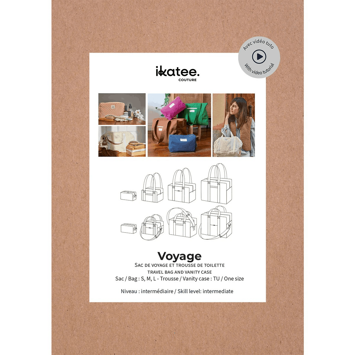 Voyage est un patron de sac et de trousse de toilette qui s’adapte à tous vos besoins (trousse de toilette, sac de voyage, sac de yoga, sac de crèche, besace, sac à main etc.). Ce modèle est entièrement doublé, possède des rangements intérieurs, des poches extérieures, une ouverture par fermeture à glissière et des anses. Deux longueurs d'anses sont possibles pour le sac : pour un porté épaule ou main, et une bandoulière optionnelle permettra un porté croisé.