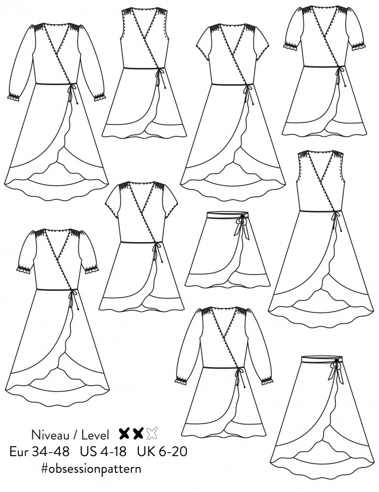 Robe portefeuille pleine d'élégance et de détails raffinés: fronces sur l'épaule, volant évasé au bas de la jupe, finitions coutures anglaises. Manches sobres ou froncées, longues ou courtes. Deux longueurs de robe, à décliner également en jupe seule.
