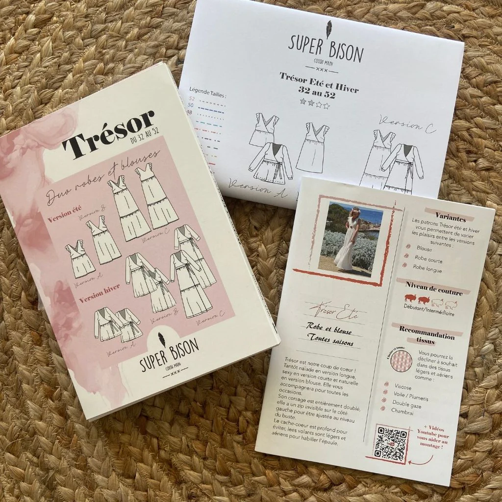 Ce patron se présente sous la forme d'une jolie pochette comprenant la planche de patron à taille réelle gradée du 32 au 52 (soit 10 tailles) avec les 2 versions du modèle Trésor : la version été zippé avec mancherons à volants et la version hiver portefeuille avec ses manches 3/4 et ses manches longues.